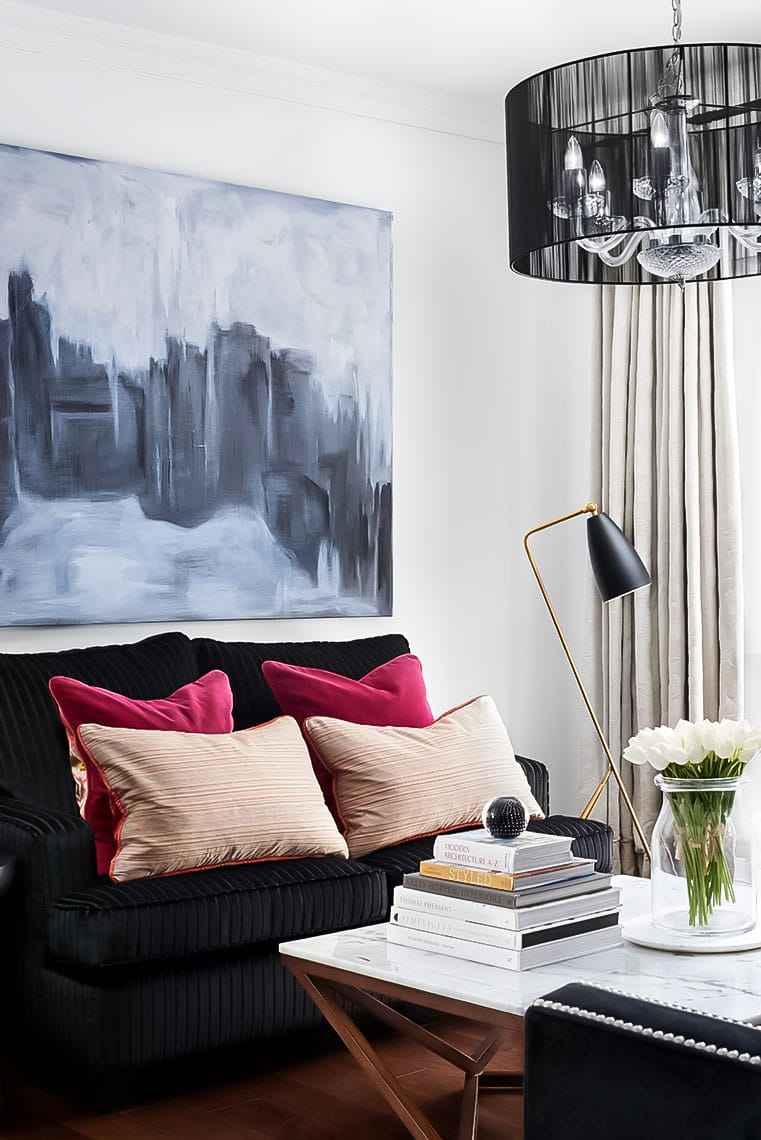 The loveseat hosts another custom art piece by a local artist and the comforts of brightly selected orange and fuschia feather pillows. A surrounding light colour palette is punctuated by robust colour within the centre of this small living room.