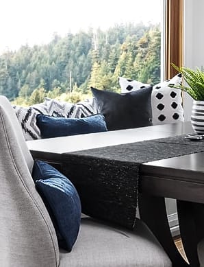 Elegant and cozy dining room configuration placed in front of beautiful picture windows