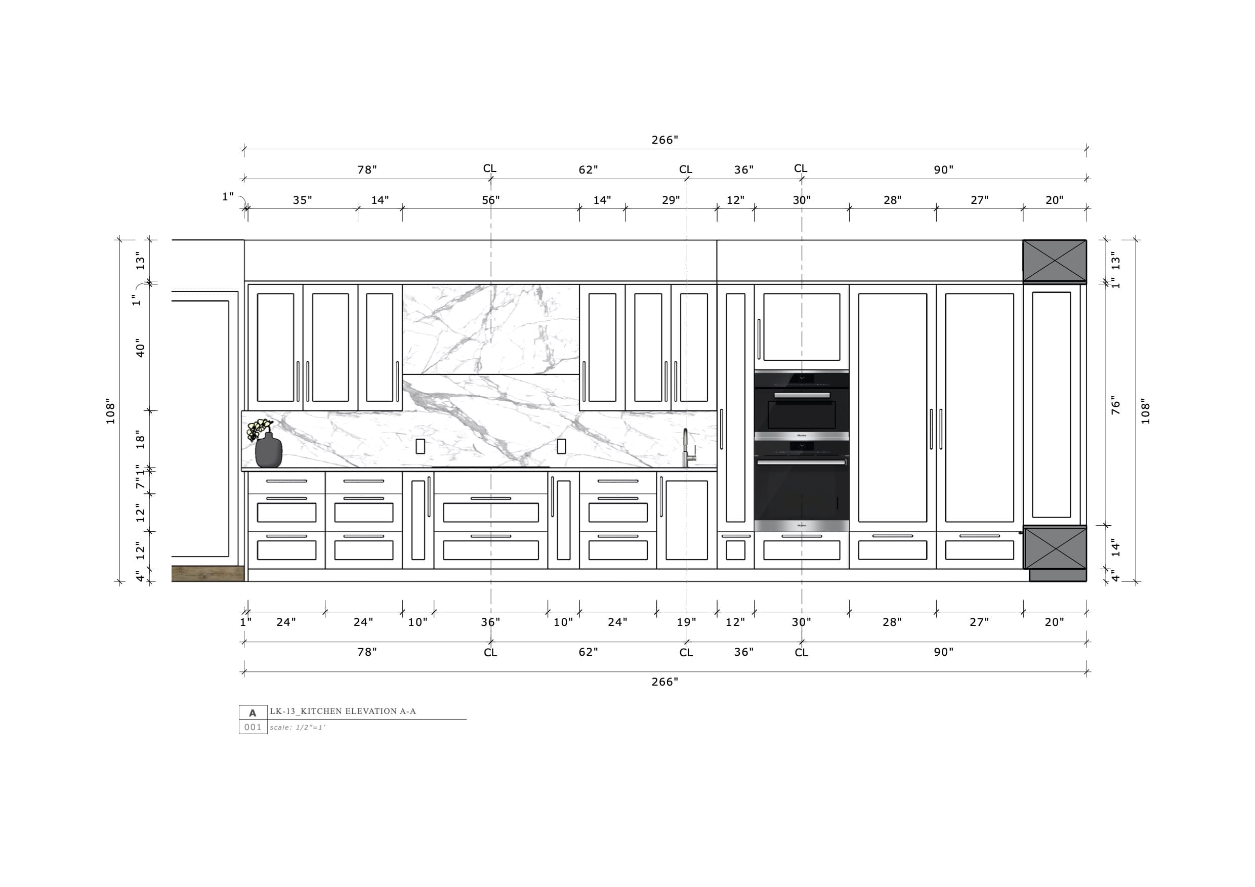Elegant wall of white cabinetry contrasted with the bold veining of marble