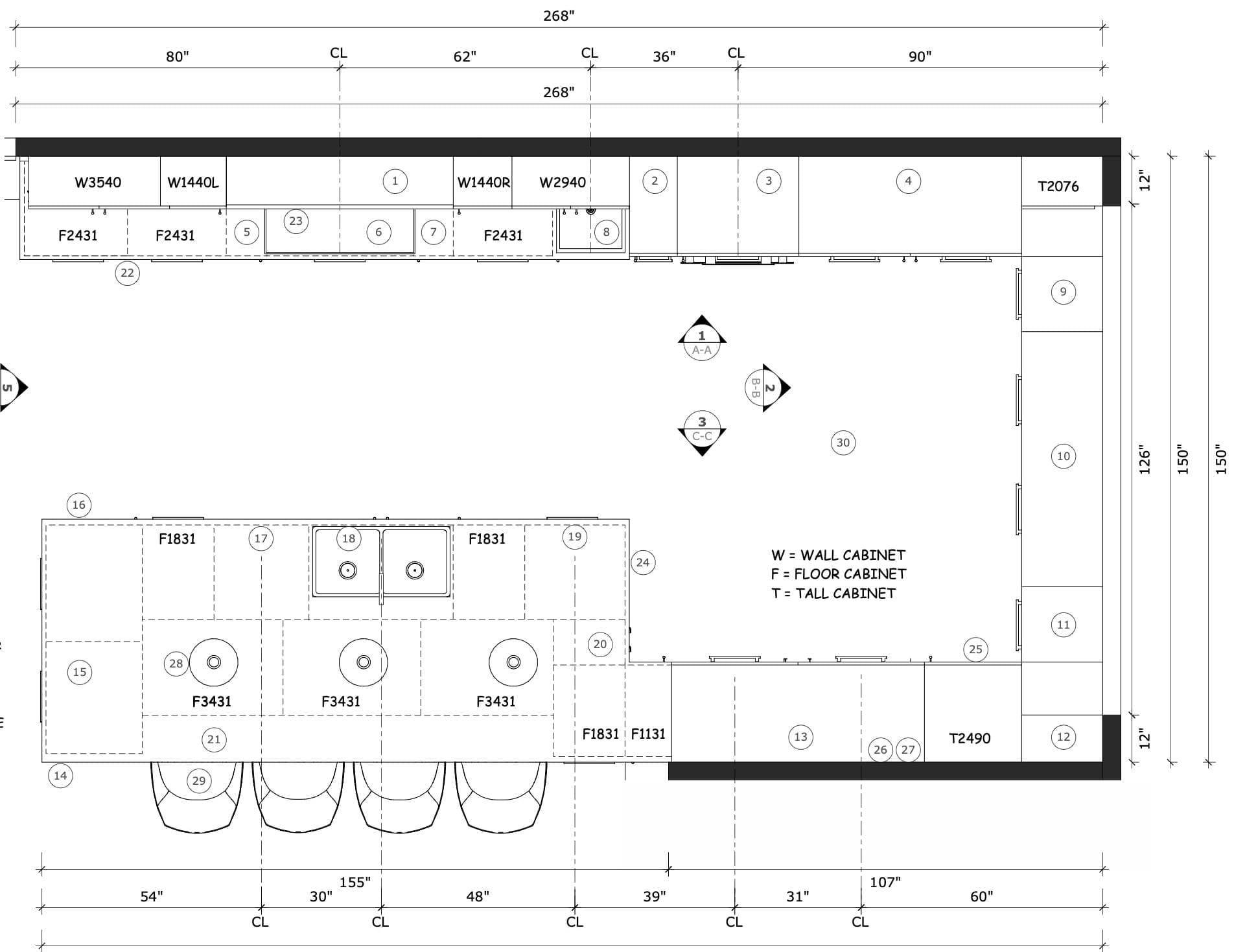 Deep blue cabinetry accented beautifully with a textured black granite countertop