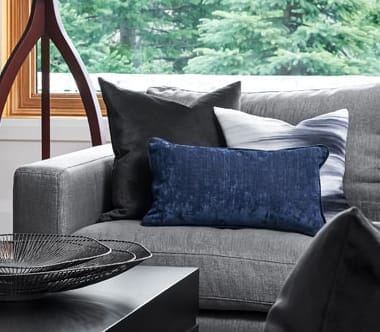 Comfortable sitting area accented by the grand picture window, plush sectional sofa, custom coffee table, and custom cabinetry