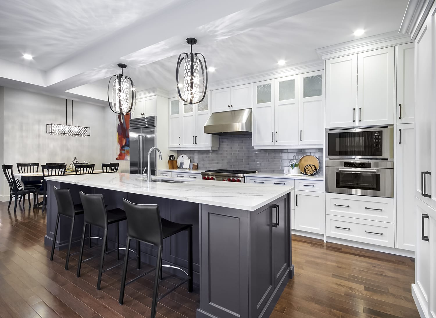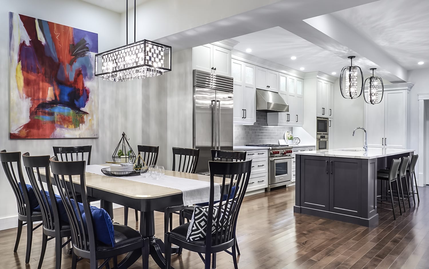 The beautiful view across the new open-concept Table and Kitchen zones within Project Queens Lane is stunning. The interesting blend of bold contemporary design elements with classic cabinetry and timeless floors....gorgeous!