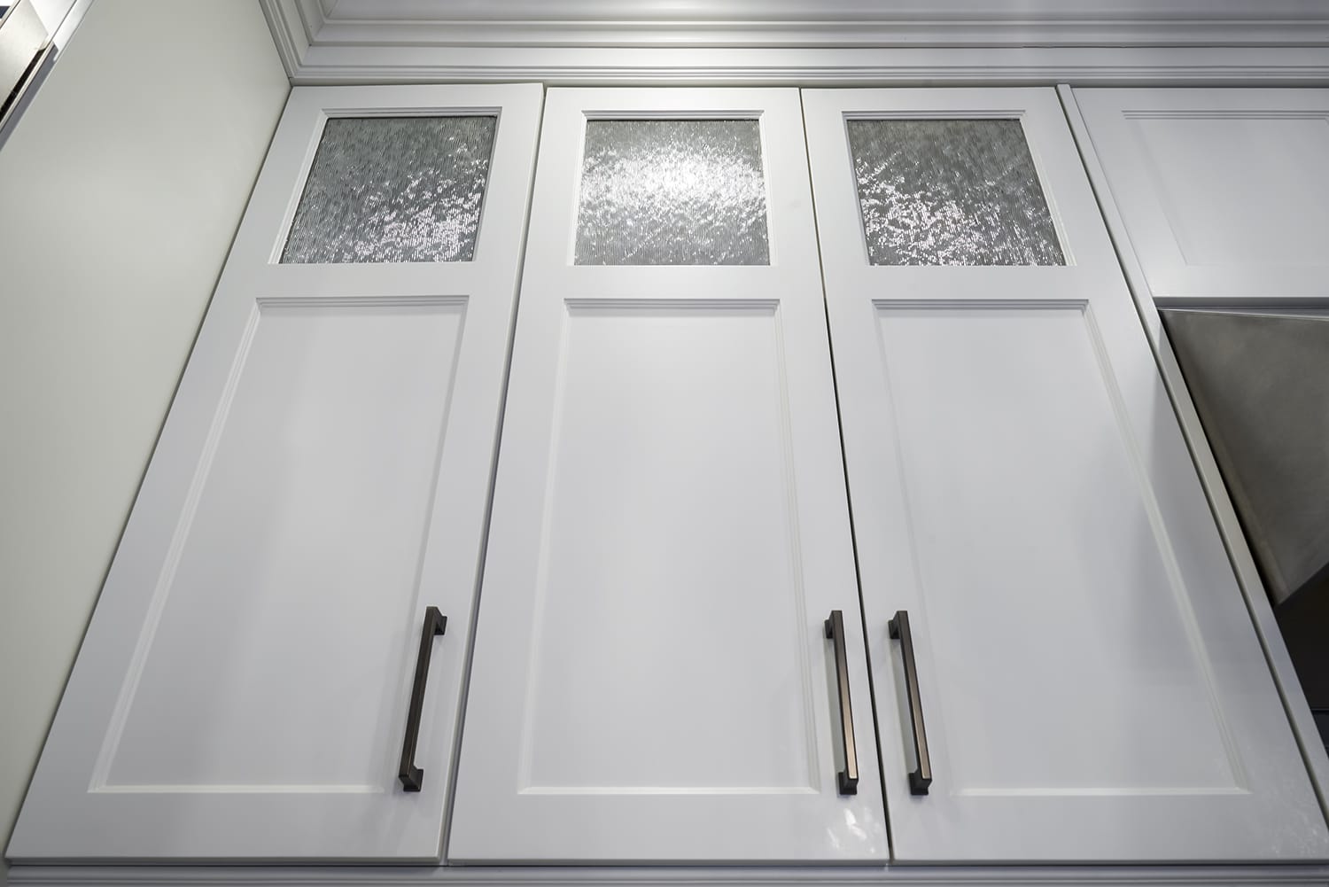 Tall Soaring Upper Cabinetry with Glass Inserts