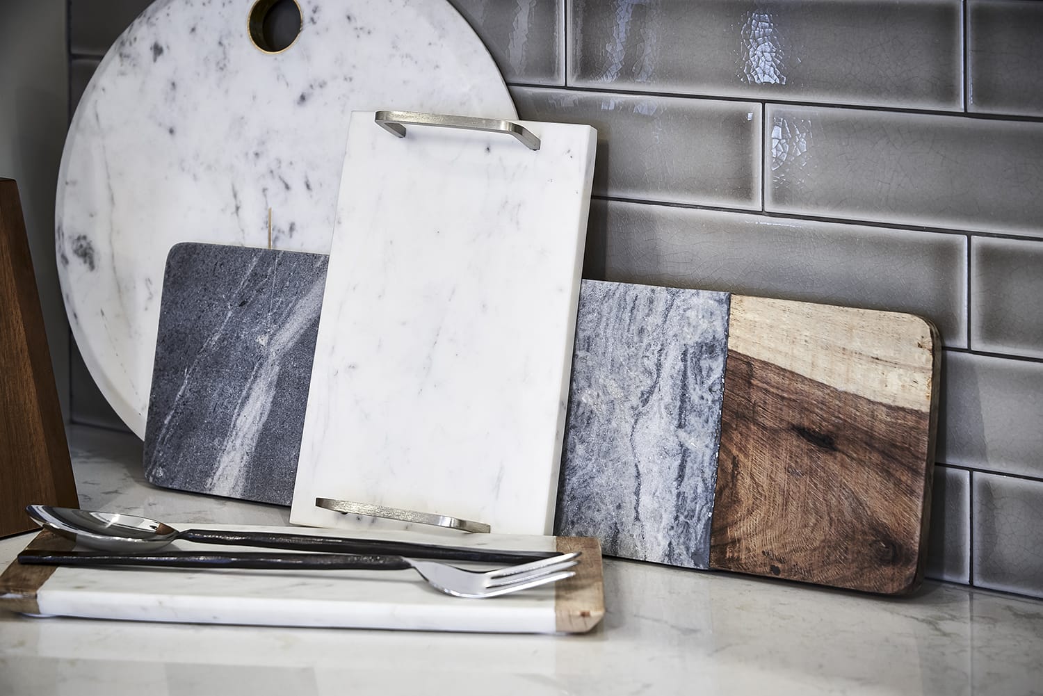 Crispy Fern Kitchen Vignette with marble cutting and serving boards